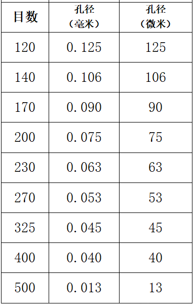 那目数是怎么换算成孔径的?这里整理了3张标准筛网规格表,用的时候可供参照。